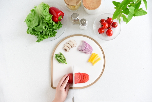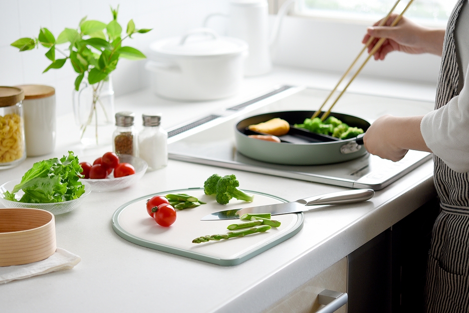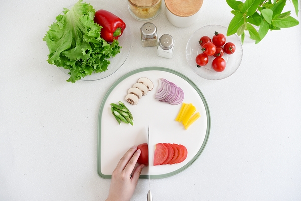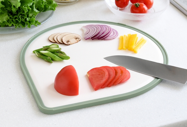 本品は、こだわりの「しずく型」の独自形状により、食材をカットするためのスペースと、切った後の食材を端に寄せて一時置きできるスペースを両方確保した、作業効率の良いまな板ができました。