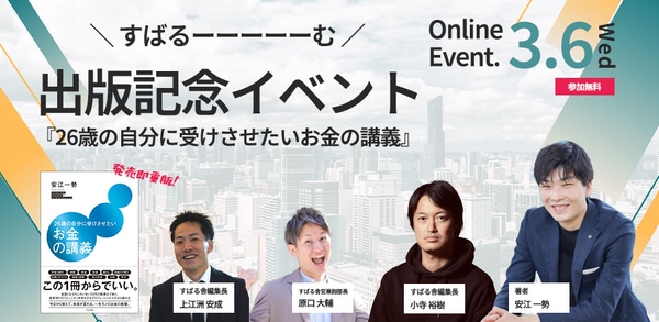 すばるーーーーーむVol.3!発売即重版決定『26歳の自分に受けさせたいお金の講義』出版記念【オンラインイベント】3月6日(水)20時開催! Guest:安江一勢先生!!
