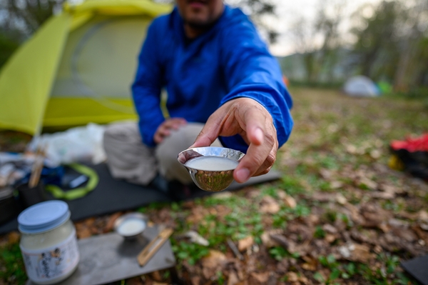 山の中では新緑の緑や、焚火の火が映り込む姿が、お酒を格別なものにします。酒器の重さを感じないくらい軽量で、お酒そのものを持って口に運ぶ感覚が得られます。高級感のある桐箱入りで、特別仕様の「TibiTibi」に仕上げました。