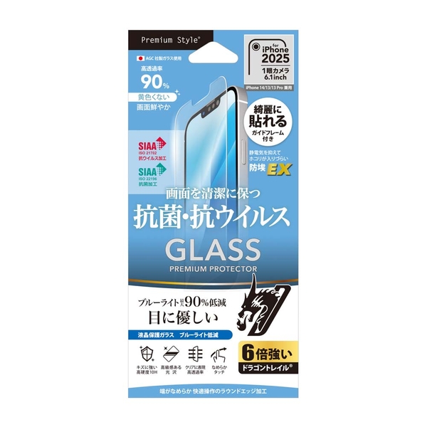 抗菌、抗ウイルス仕様の iPhone 16e/iPhone14/iPhone13/iPhone13 Pro兼用 液晶保護ガラス ブルーライト低減です。