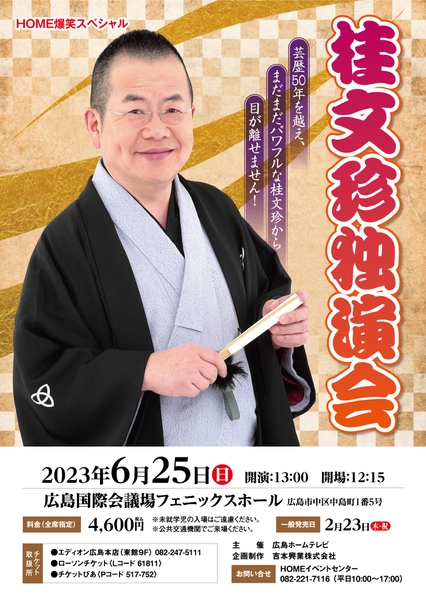 広島ホームテレビ(所在地:広島県広島市)は、主催で2023年6月25日(日)「HOME爆笑スペシャル 桂文珍独演会」を広島国際会議場フェニックスホールで開催いたします。