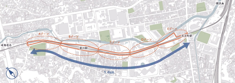 計画では、相模鉄道本線(星川駅~天王町駅)連続立体交差事業において鉄道高架化により創出された、全長約1.4㎞のエリアをA~Eゾーンの5つのゾーンに分けて開発します。この開発エリアは、2020年12月に横浜市保土ケ谷区が策定した「星川駅周辺地区総合的なまちづくりガイドライン」に基づき、「駅周辺と高架下」を中心として、今まで分断されていた地区の南北を一体化したまちづくりを推進するとともに、星川駅周辺地区全体の利便性を向上し、にぎわいと交流を創出するまちづくりを推進するエリアとしています。