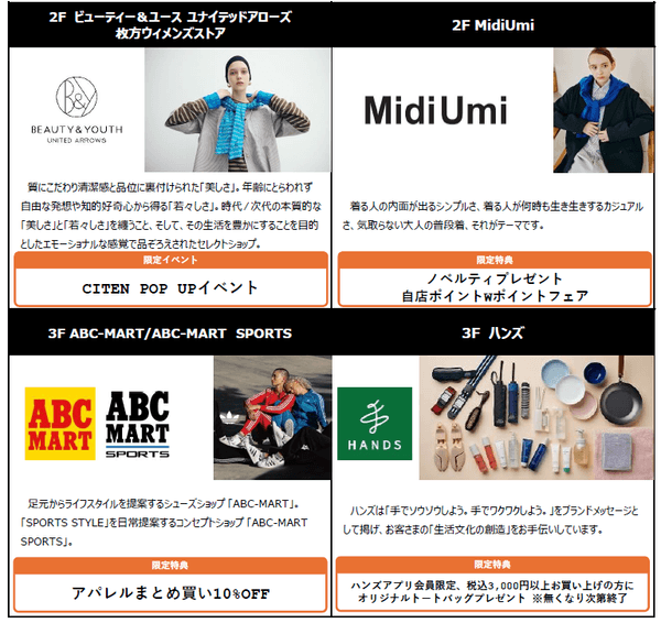 日頃の感謝を込めて、館内では多彩なフェアを開催。人気ブランドや話題のショップによる限定施策が盛りだくさん。ここでしか手に入らないアイテムや特典もお見逃しなく。※実施内容は変更になる可能性がございます。
