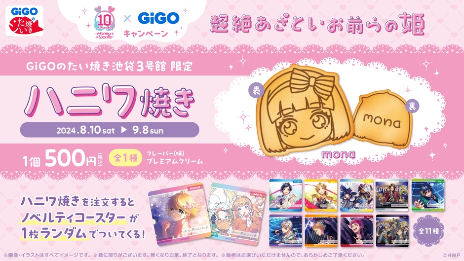 GiGOのたい焼き池袋3号館にて『HoneyWorks 告白実行員会~アイドルシリーズ~』より、monaをモチーフにした「ハニワ焼き」を販売いたします。