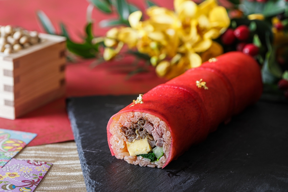 ささがき牛蒡や有馬山椒、生姜で甘辛く煮たてた国産牛のしぐれ煮と、“北海道産しほろ牛”のローストビーフ2種のお肉をふんだんに具材に取り入れた贅沢な恵方巻。春菊や大葉、ミョウガの酢漬け、きゅうり、卵焼きなどの食材と合わせ、ビーツで炊き上げた酢飯とマリネした紅くるり大根を纏わせて色鮮やかに仕上げました。※一本約20cm