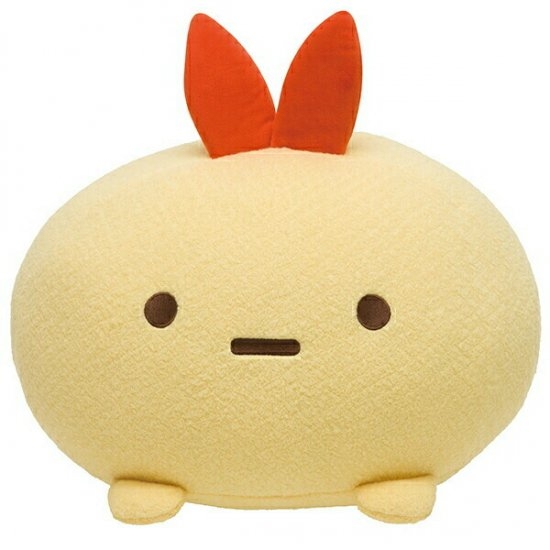 まずはえびふらいのしっぽ。エビフライといえばサクサクしていますがこの子はもちもちです。このクッションの名前は”スーパーもちもち大福クッション”