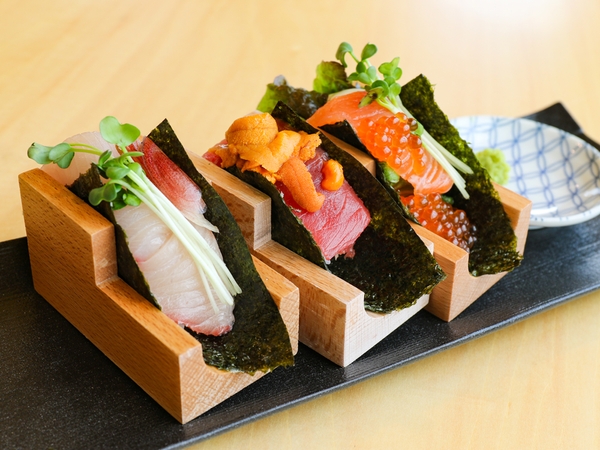 海の恵みを楽しめる「手巻き寿司」は、3種セットをご用意。さっぱりとした赤身から濃厚な大トロまで楽しめるセットやとろけるサーモンに香ばしいウナギ、歯ごたえのある鯛を組み合わせたセットなど、一口食べれば、それぞれの個性が光るネタとシャリが織りなす贅沢な味わいを堪能できます。色々なネタが楽しめるのもセットならでは!