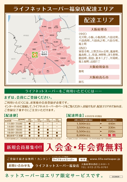 ご注文いただいた商品を店舗からご自宅へお届け「ライフネットスーパー福泉店」サービス開始【堺市内の配達エリアを拡大、和泉市・高石市の一部地域でもご利用可能に!】