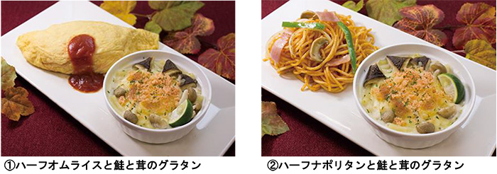 「鮭と茸のグラタン」に、(1)ハーフオムライスまたは(2)ハーフナポリタンを組み合わせました。 それぞれの秋のあたたかなメニューをお楽しみください。