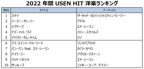 2022 年間 USEN HIT 洋楽ランキングで1位に輝いたのは、ザ・キッド・ラロイ×ジャスティン・ビーバー『ステイ』でした。オーストラリア・シドニー出身の19歳、ザ・キッド・ラロイが日本でも大人気のジャスティン・ビーバーを迎えて制作した楽曲です。2021年7月のリリース作品で昨年の年間ランキングでも3位にランクインしていたこの曲は、週間ランキング1位に累計12回も輝くなど驚異のロングヒットを続け、見事に今年の年間1位を獲得しました。