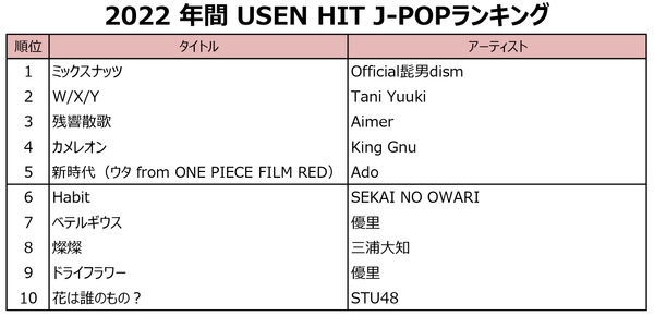『2022 年間 USEN HIT ランキング』では、今年1年、多くの商業施設や公共施設、飲食店のBGMなどを通して親しまれた“日本中で耳にした愛され楽曲”のランキングを発表します。ぜひご注目ください。