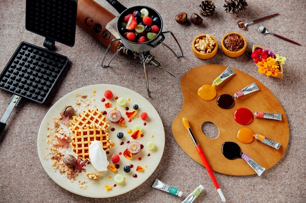 スケッチの合間の休憩時間には、アート気分を楽しめるスイーツ作りを体験します。キャンバスに見立てた皿をワッフルとフルーツで自由に彩る一品です。アウトドア器具で焼き上げたワッフルに温めたフルーツをのせ、仕上げには色とりどりのソースやナッツなどのトッピングを飾って楽しめます。アウトドア器具に慣れていない方でも、グランピングマスターがサポートするので、アート気分を楽しみながら美味しいスイーツが作れます。