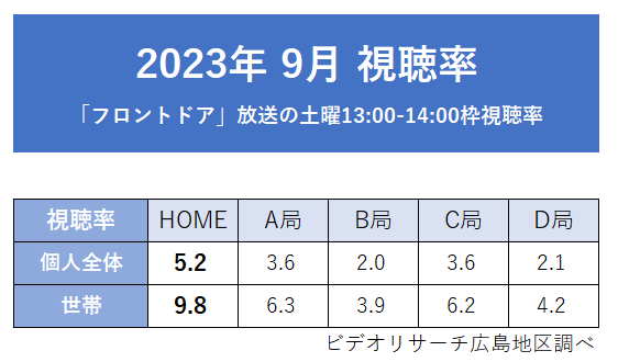 広島ホームテレビ(本社:広島市中区)で毎週土曜ごご1時から放送、ひろしま深掘りライブ「フロントドア」は、2023年度上期・7月クール・9月の月間平均視聴率で個人全体・世帯いずれも同時間帯1位(ビデオリサーチ調べ、広島地区)を記録しました。