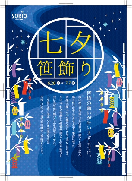 内容:大きな本物の笹に、短冊(皆様の「願い事」)や風車・風鈴等を装飾いたしております。