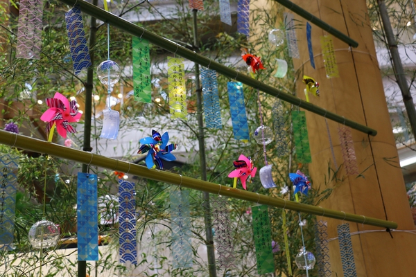竹細工の飾り棚に、透明なデザイン短冊を設置し、さらに風で回る風車や、風鈴の音でいつもとは違う動きのある装飾に!