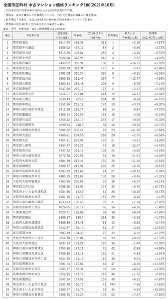 「マンションレビュー」2021年10月 全国市区町村 中古マンション価格ランキング100を発表