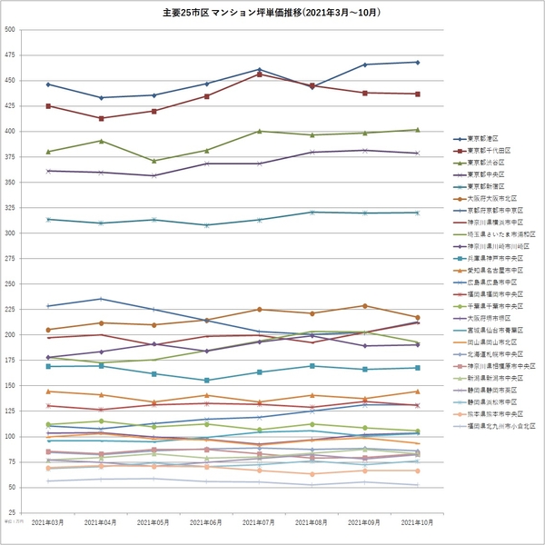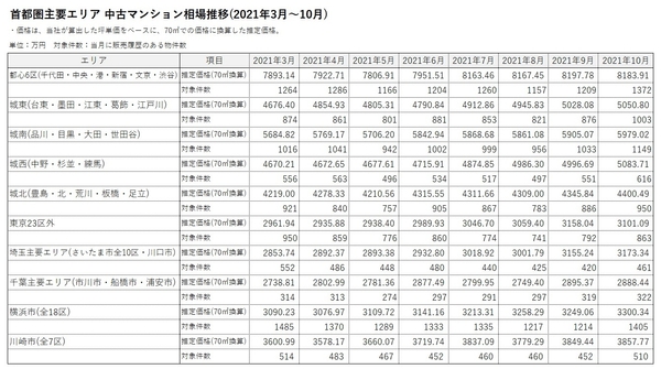 ・東京都内での2021年10月の推定価格は以下の通り。(カッコ内は坪単価)