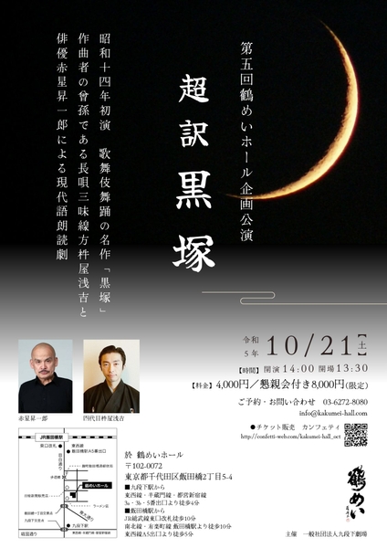 昭和14年二代目市川猿之助初演、歌舞伎舞踊の名作「黒塚」の現代語版朗読劇。作曲者の曾孫である長唄三味線方四代目杵屋浅吉の弾き唄いと俳優赤星昇一郎による朗読。