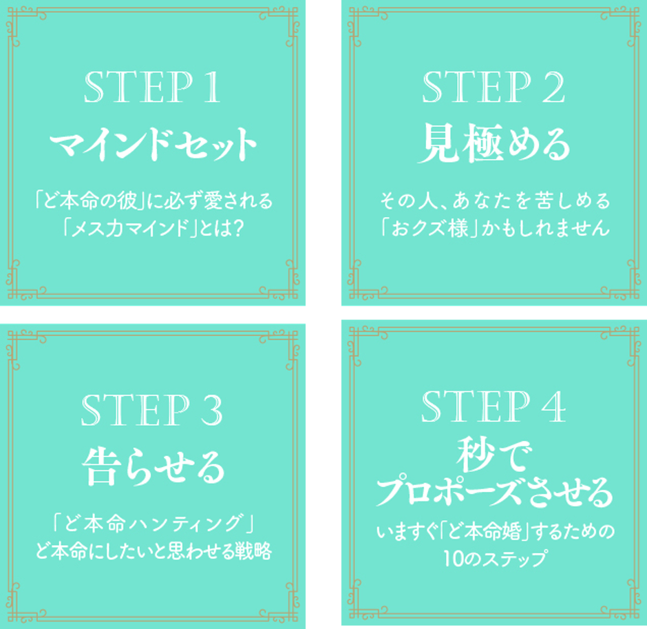 本書では下図の「4つのステップ」に沿って行動するだけで、3ヵ月で「ど本命」の男性と電撃婚を叶える「メス力」の実践法を紹介しています。