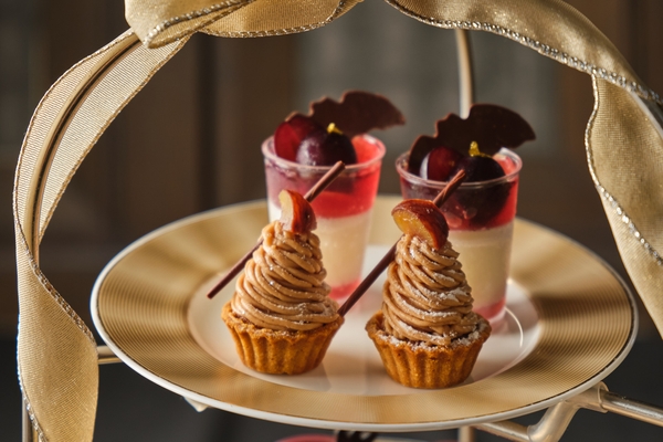 今年の秋のアフタヌーンティーのテーマは、「大人のハロウィン」。カシスと栗のモンブラン、ブドウとヨーグルトのヴェリーヌ、柿と白あんの和風マカロン、ヘーゼルナッツとアマレットのオペラなどのスイーツに加え、パンプキンミートパイ、紫芋のミニベーグルなど、秋の味覚をふんだんに取り入れた上品なスイーツや軽食をお楽しみいただけます。