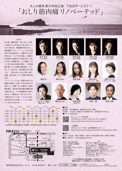 大人の麦茶主催、大人の麦茶 第29杯目公演『おしり筋肉痛 リノベーテッド』が2022年4月6日(水)~4月17日(日)に下北沢ザ・スズナリ(東京都世田谷区)にて上演されます。チケットはカンフェティ(運営:ロングランプランニング株式会社、東京都新宿区、代表取締役:榑松 大剛)にて2月19日(土)12:00より発売開始です。