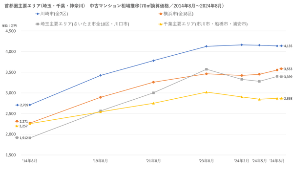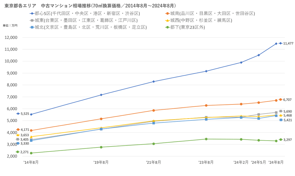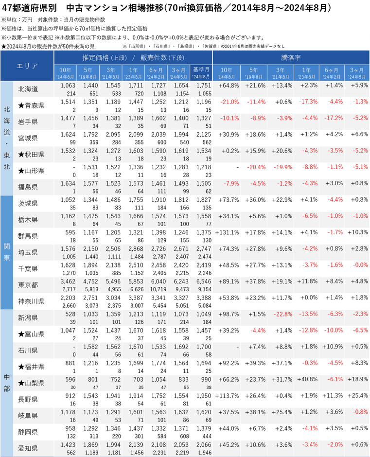 「不動産×WEB×ビッグデータ」の領域で、さまざまな不動産テックサービスを展開する株式会社ワンノブアカインド(本社:東京都港区、代表取締役社長:川島 直也、以下当社)は、当社が運営しているマンション情報サイト「マンションレビュー」の保有データを元に、全国の2024年8月の中古マンション相場を調査。坪単価をベースに70㎡での価格に換算した「中古マンション価格」*1について、10年前・5年前・3年前・前年からの推移を都道府県別・エリアごとにまとめましたので、発表いたします。