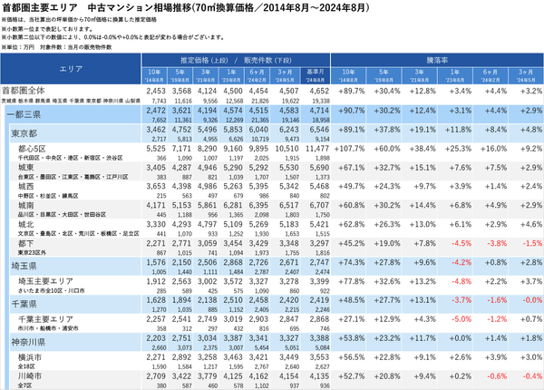 「マンションレビュー」2024年8月 全国中古マンション相場推移を発表