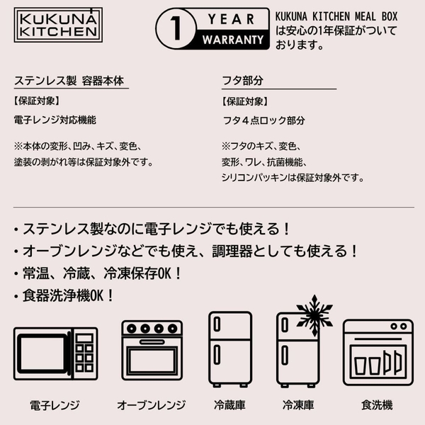 壊れやすい蓋の止め部分、本体の電子レンジ対応機能が安心の1年保証付き。長く、安全にお使いいただけます。