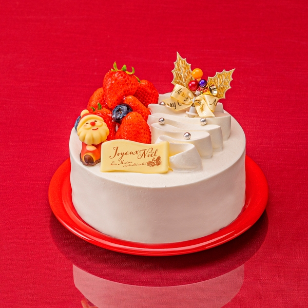 いちごシロップをしみ込ませたスポンジに甘酸っぱいいちごを重ね、可愛らしいサンタを飾ったラ・メゾンのクリスマスショートケーキです。
