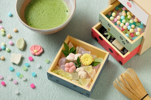 15時~16時の間にチェックインした人のみ限定で注文できる「ウェルカムお菓子箱」。かわいいお菓子箱の中には、すっきりしとした甘さで口溶けの良い和三盆糖や、まるで宝石のように見えるかわいらしい琥珀羹のほか、金平糖や甘納豆などの和菓子が入っています。客人をもてなす茶の湯文化にならい、抹茶とともに提供します。