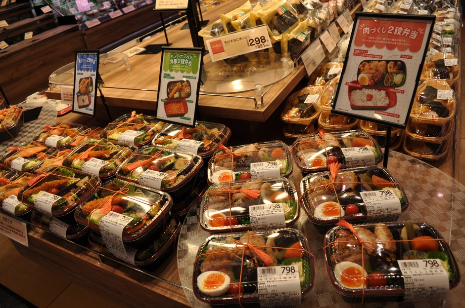 お弁当の品ぞろえは圧巻の60種類!周辺のオフィスにお勤めの方のランチやお仕事帰りの方の夕食ニーズにお応えいたします。新商品として、「肉づくし」「魚介づくし」などおかずがたっぷり入った2段弁当をご提供いたします。