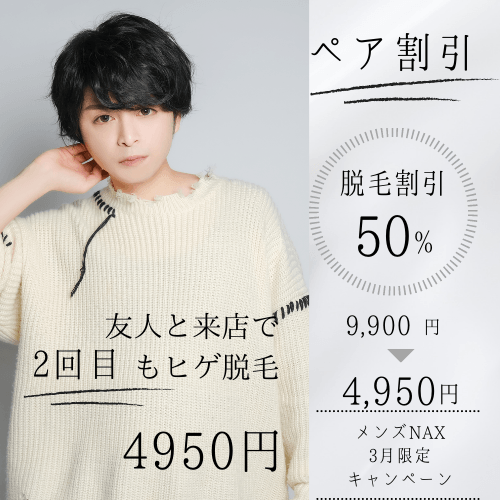 2名様同時来店でヒゲ脱毛全体50パーセントoff