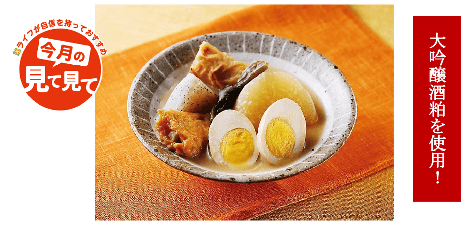 ライフが自信を持っておすすめする「今月の見て見て」の近畿圏9月商品に選ばれた「大吟醸酒粕入り 粕汁風おでん」は、大吟醸酒粕のフルーティーな香りが特徴のライフオリジナルのおでんです。創業1808年の「小山本家酒造」が作る香り高い大吟醸酒粕を本枯節と利尻昆布のだしに合わせ、酒粕の風味豊かなスープが具材にも染み込んだ粕汁風のおでんに仕上げました。