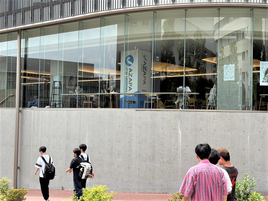 「AZAPA HALL」は、2022年3月に竣工した研究実験棟Ⅳ 1Fにあり、同棟を主に利用する理工学部(メカトロニクス工学、交通機械学、機械工学、材料機能工学)の学生のグループ学習や憩いの場として人気のスペースです。