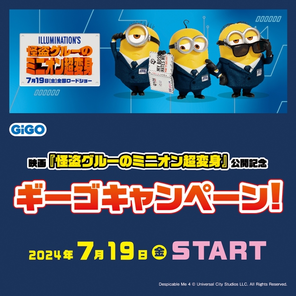 株式会社GENDA GiGO Entertainment(本社:東京都港区 代表取締役社長:二宮 一浩 以下当社)は2024年7月19日(金)より、GiGOグループの対象店舗にて、映画『怪盗グルーのミニオン超変身』の公開を記念した、オリジナルデザインのうちわがもらえるコラボキャンペーンを開催いたします。