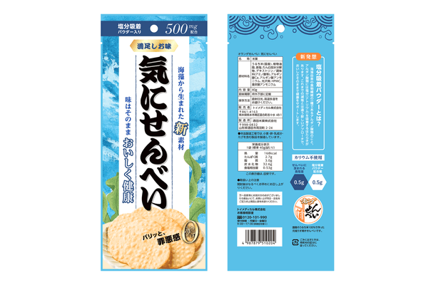 元々この塩分吸着パウダーは、サプリメント(商品名:デルソル)や減塩調味料(商品名:零しお)の成分として販売していますが、気にせんべいのように食品に使用して発売するのは今回が初めてとなります。