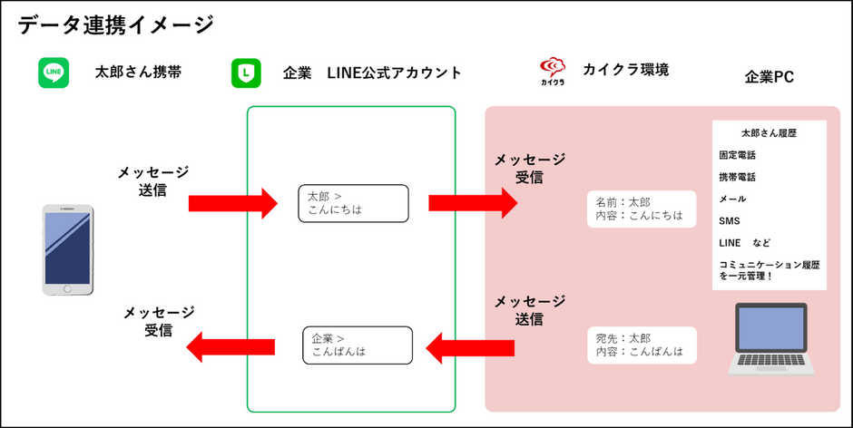 本連携により、カイクラ上で企業のLINE公式アカウントのトーク履歴を一元管理することができます。他のカイクラ機能である電話、SMS、メール、ビデオ通話と合わせてお客様とのコミュニケーションを一元管理できるため、より適切かつ迅速なお客様対応や担当者への情報伝達が行えます。