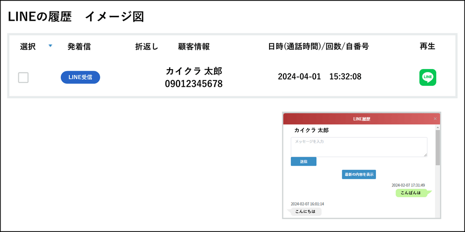 従来の固定電話、携帯電話、メール、SMS、ビデオ通話の履歴にLINEのトーク履歴を加えた、あらゆる顧客コミュニケーションの履歴を一元管理できるため、お客様への連絡をシームレスに行うことができます。