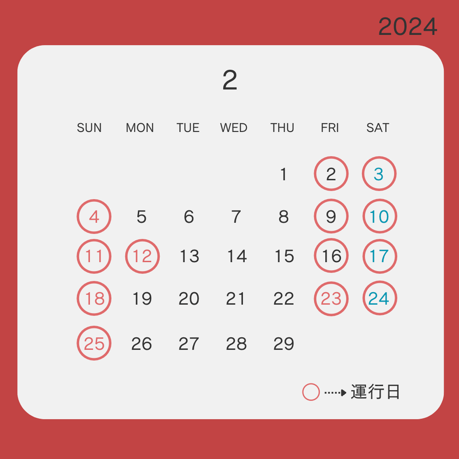 運行予定:2月2日(金)〜4日(日)、9日(金)〜12日(月)、16日(金)〜18日(日)、23日(金)〜25日(日)