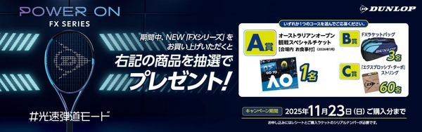 住友ゴムグループの(株)ダンロップスポーツマーケティング(社長:家田冨弘)は、飛びとスピードを追求したパワー系テニスラケットダンロップNEW「FX」シリーズ4機種を2025年11月9日より、ジュニア用モデル2機種を2026年1月17日より販売します。メーカー希望小売価格は、11,000円(税抜価格:10,000円)~40,700円(税抜価格:37,000円)です。今回NEW「FX」シリーズ発売記念として、対象商品をご購入いただき、特設サイトを通じてご応募いただいた方の中から抽選で「全豪オープン」観戦チケットなど、豪華賞品をプレゼントするキャンペーンを2025年11月23日まで実施します。
