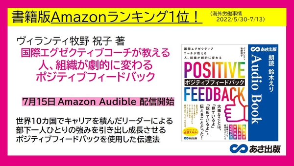 ヴィランティ 牧野 祝子 著『国際エグゼクティブコーチが教える 人、組織が劇的に変わる ポジティブフィードバック』2022年7月15日 Amazon Audible にて配信開始
