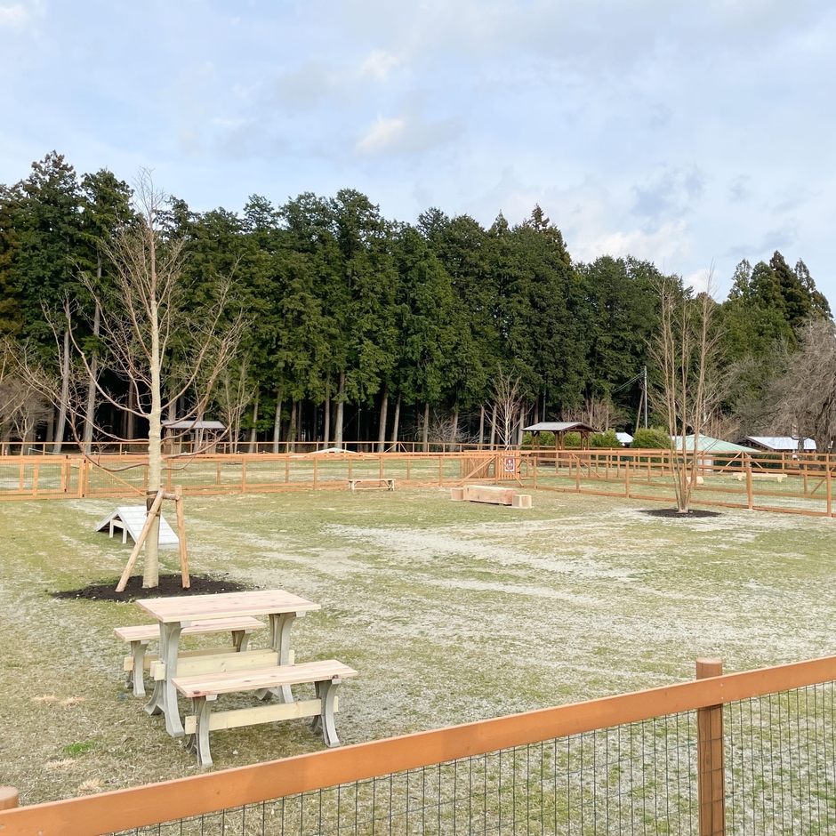 全面芝生、ヒメシャラの木陰、足洗い場、日よけスペース、フォトスポットも完備。ファームレストランのパラソル席ではワンちゃんと一緒にお食事も楽しめます。