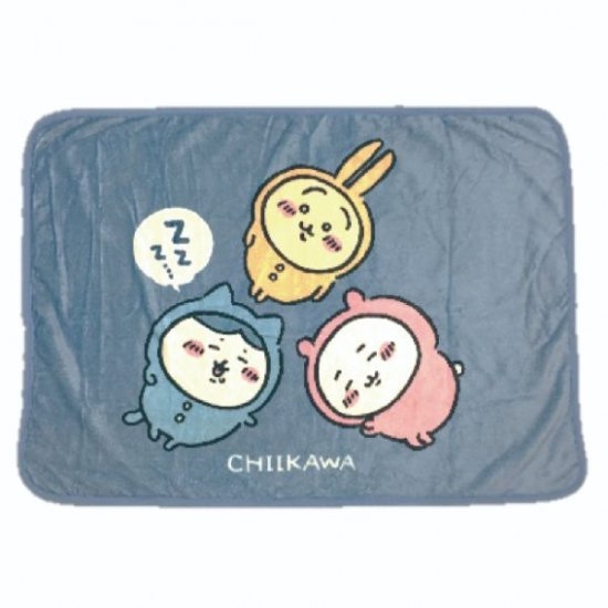 グレーのブランケットには、ちいかわとハチワレ、うさぎの3キャラが勢揃い♪みんな気持ちよさそうで、よく見るとハチワレはすやすや眠っています。
