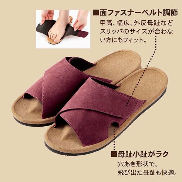 甲高、幅広、外反母趾などスリッパのサイズが合わない方にもぴったりフィットするように調整できるように致しました。