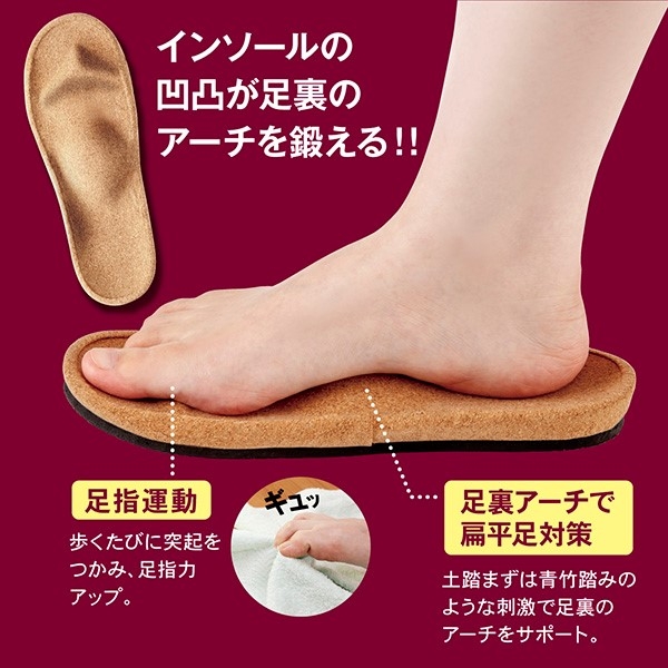 歩たびに指の下の突起をつかむような凹凸のある形状が自然に足指つかみになるように設計されています。履いて歩く事で自然に足指力がアップします。