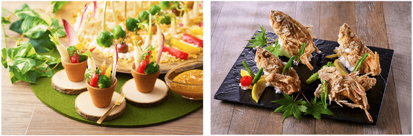 左:収穫の秋をイメージした、彩り鮮やかな「野菜畑のバーニャカウダ」。気軽につまめるサイズにカットされた野菜に、人参ドレッシングをたっぷりつけてどうぞ。