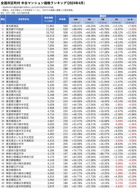 ※推定価格ランキングは2024年4月の販売件数が30件以上ある297全国市区町村、1年前比較騰落率ランキング(前年(2023年4月)と比較した騰落率からランキングを作成)は2024年4月と2023年4月の販売件数がそれぞれ30件以上ある237全国市区町村が対象。