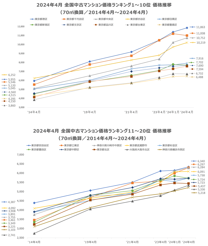 「不動産×WEB×ビッグデータ」の領域で、さまざまな不動産テックサービスを展開する株式会社ワンノブアカインド(本社:東京都港区、代表取締役社長:川島 直也、以下当社)は、当社が運営するマンション情報サイト「マンションレビュー」の保有データを元に、2024年2月の全国市区町村における中古マンションの相場を調査。坪単価をベースに70㎡での価格に換算した「中古マンション価格」*1と価格ランキング上位20件について過去10年間の価格推移、および1年前からの価格の上昇率を表す「騰落率」のランキングを発表いたします。