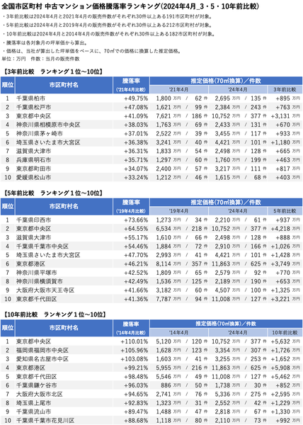 ■全国市区町村 中古マンション騰落率ランキング(2024年4月_3・5・10年前比較)