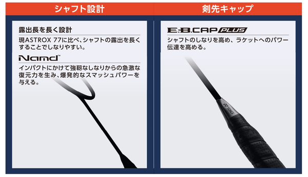シャフト部には、強靭なしなりからの急激な復元力を生むNamd™※1を搭載。加えて、現行品に比べシャフトの露出を長くするとともに、剣先キャップに「E.B.CAP PLUS(エナジーブーストキャッププラス)」を採用し高いしなりを実現。これらの技術により、しなりとしなり戻りが向上し、スマッシュの威力が2.9%※2アップしました。